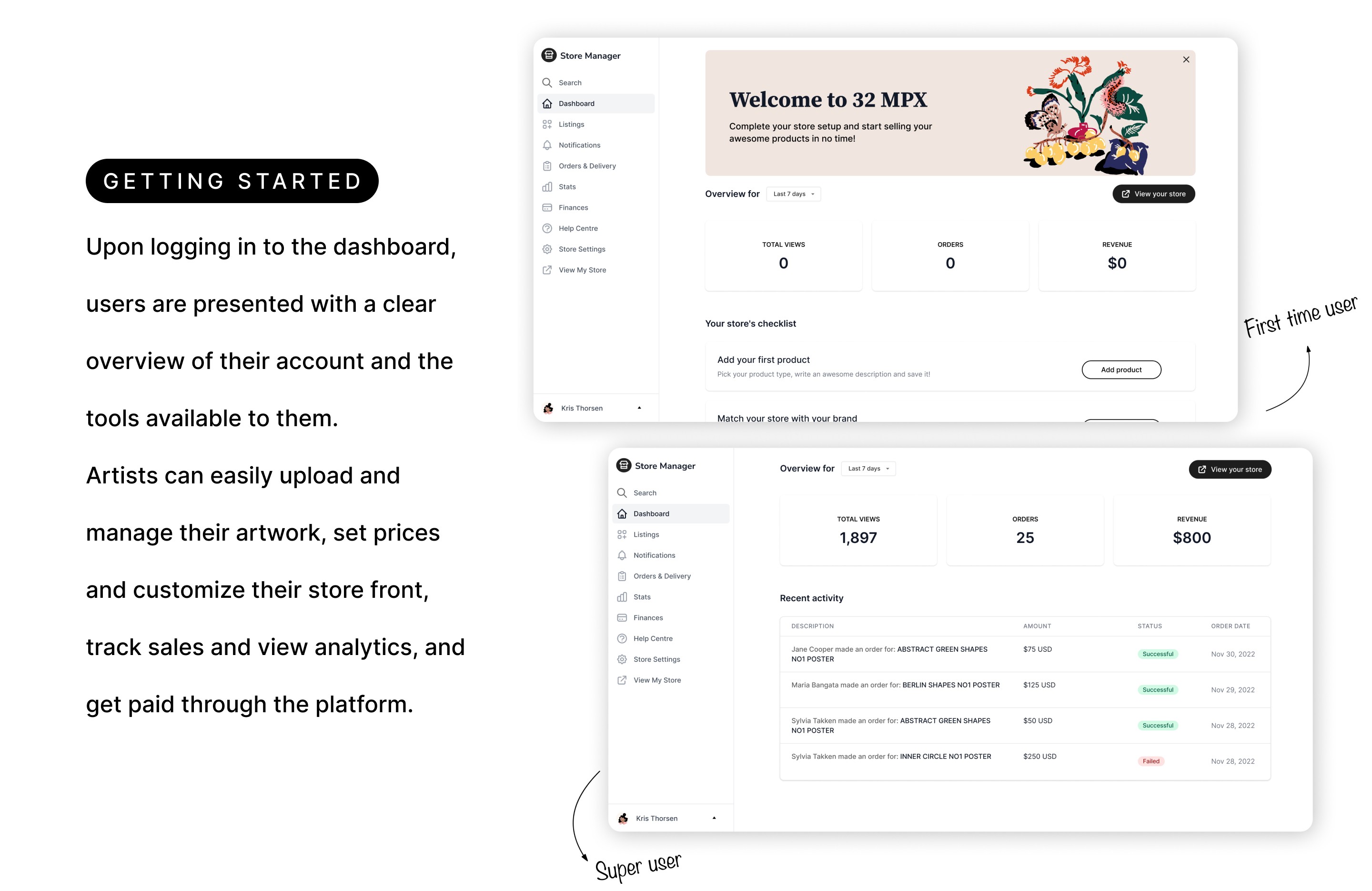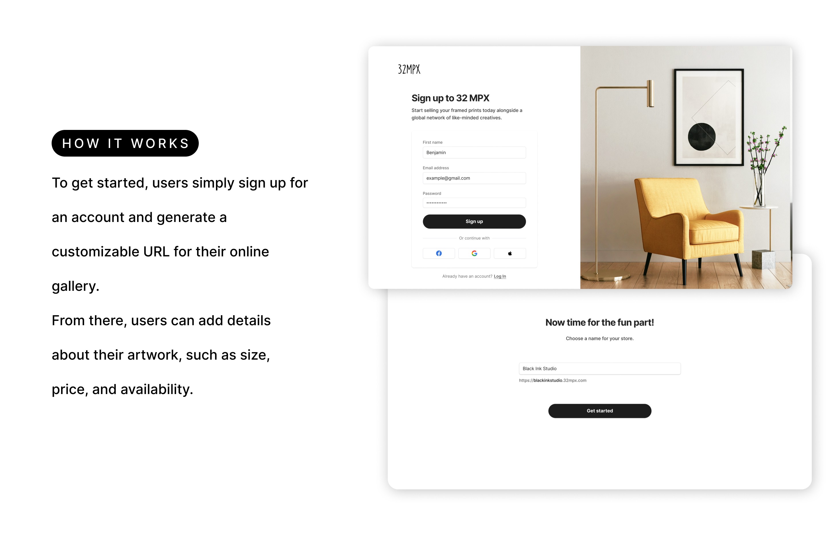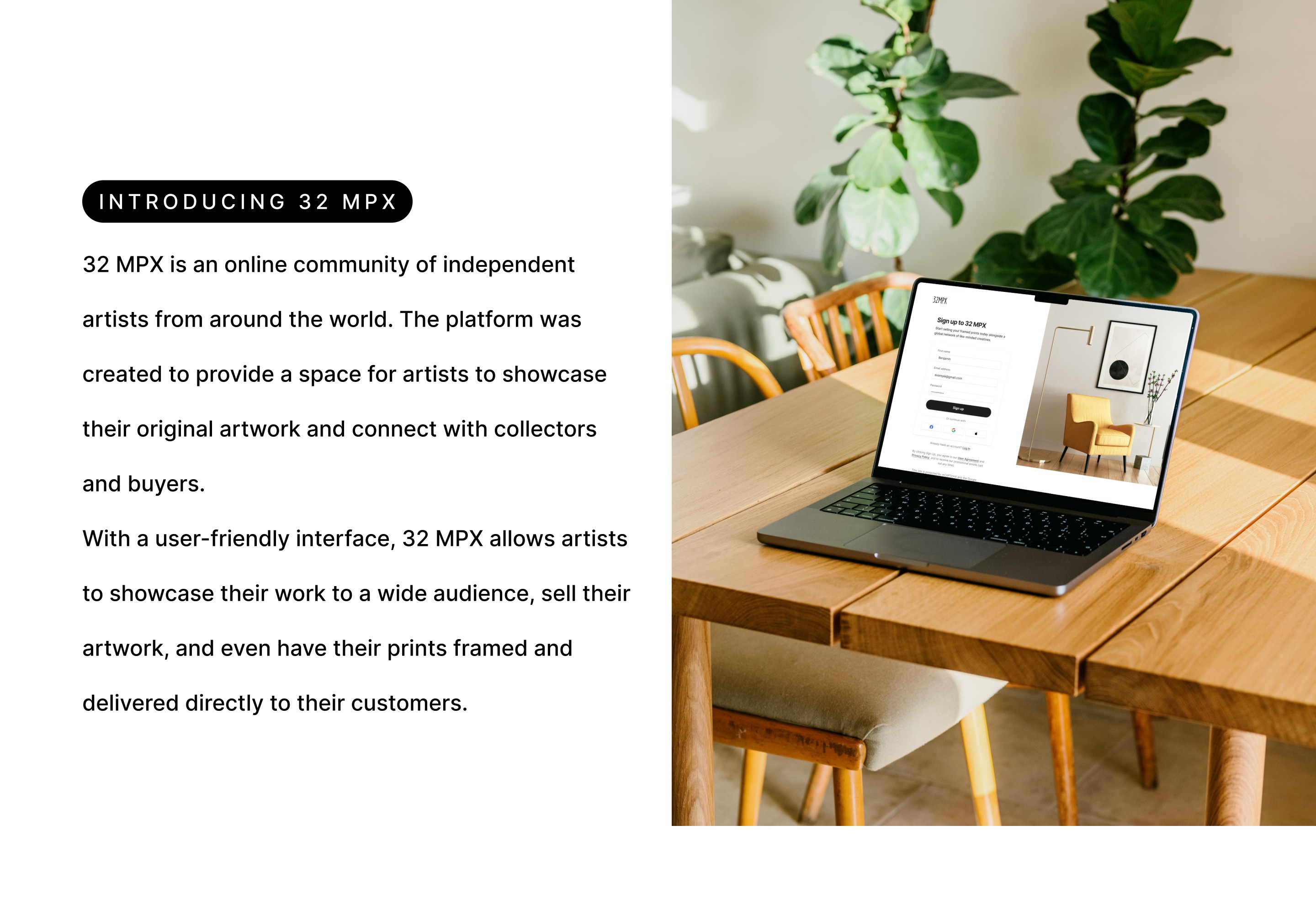 As the lead designer on 32 MPX, I collaborated closely with the founders and a team of developers to design a platform that is intuitive, accessible and tailored to the needs of independent artists. My goal was to create a user-friendly experience that would make it easy for painters, illustrators, photographers and other creatives to showcase and sell their work online. I focused on simplifying the process of setting up an online gallery, ensuring that artists could launch their presence in just a few minutes, with minimal technical effort.